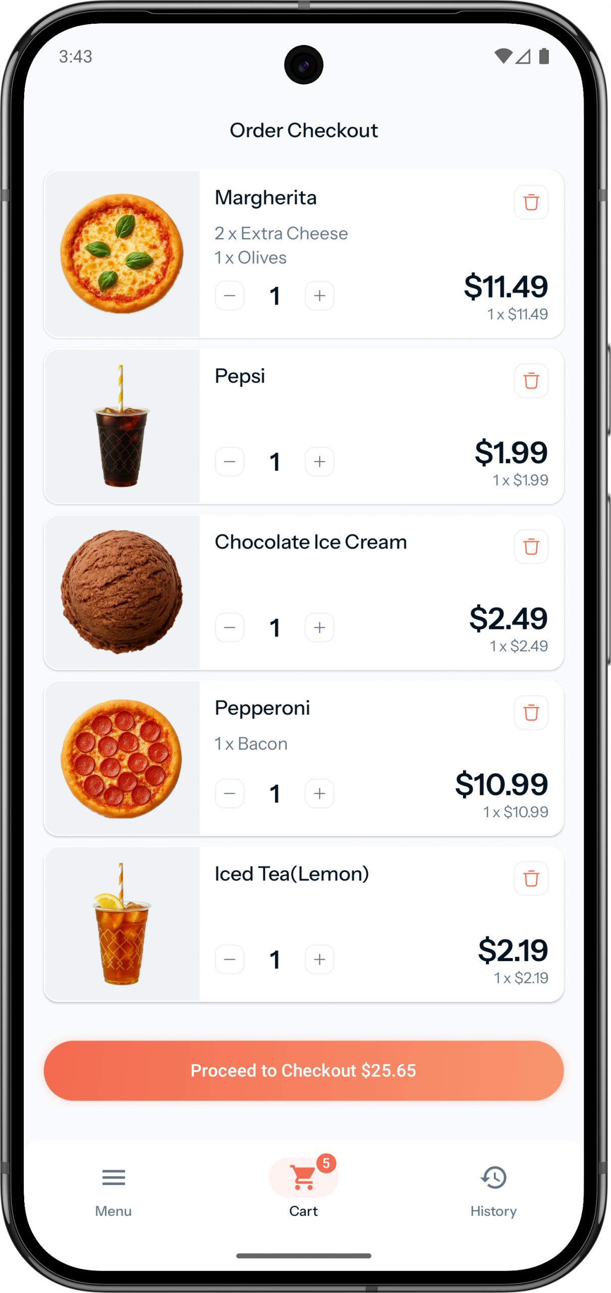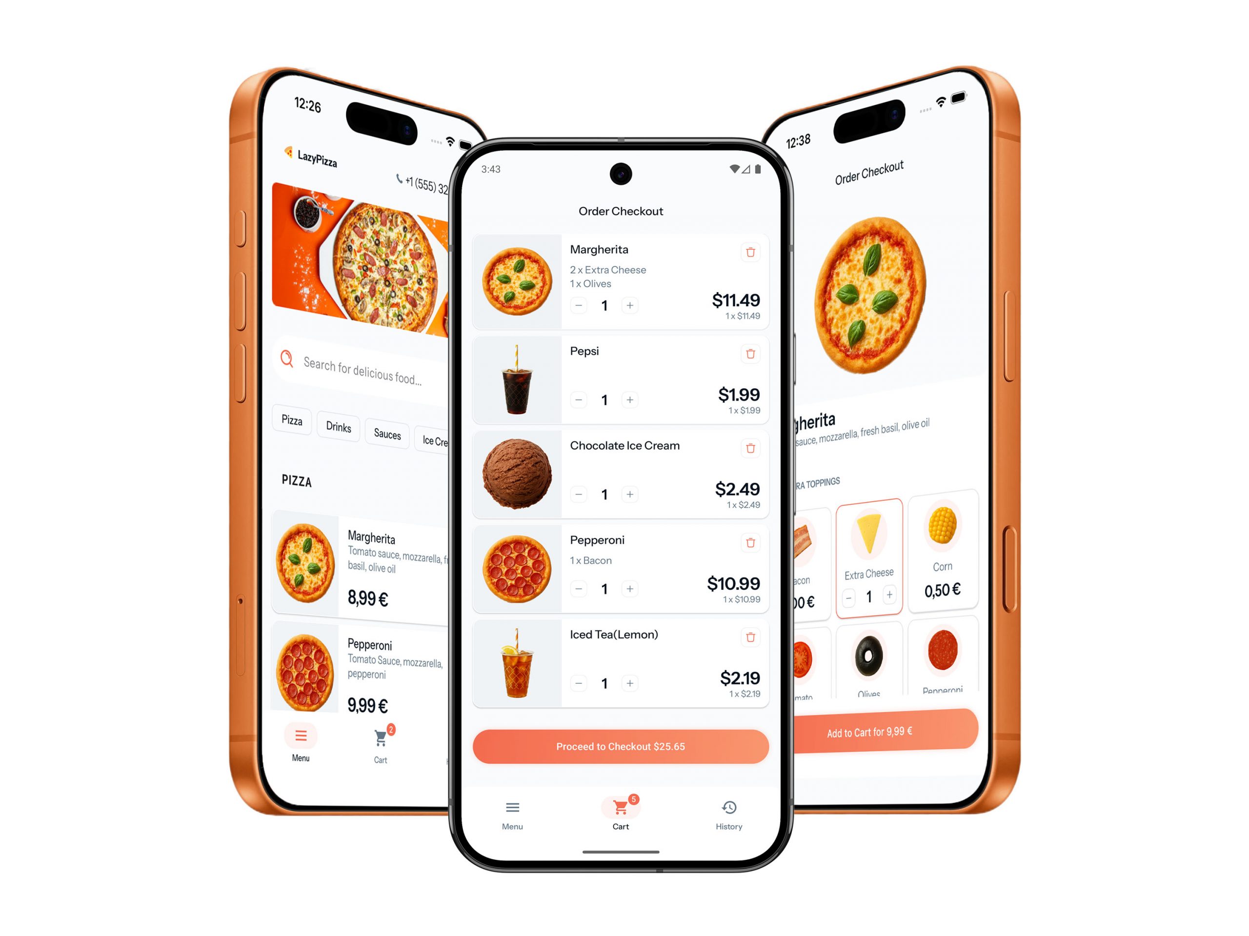 The app Lazy Pizza is a food ordering app. It is built with a custom responsive user interface.