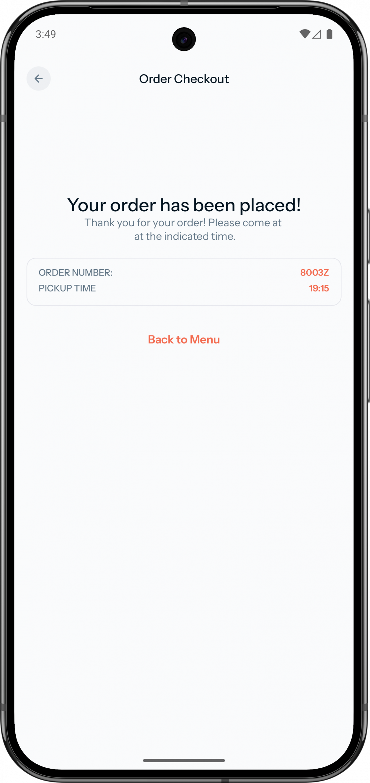 In the checkout screen users can choose between the earliest available time or a scheduled date and time for pickup. Recommended items are displayed to go with the order. Users may place a comment before placing the order.