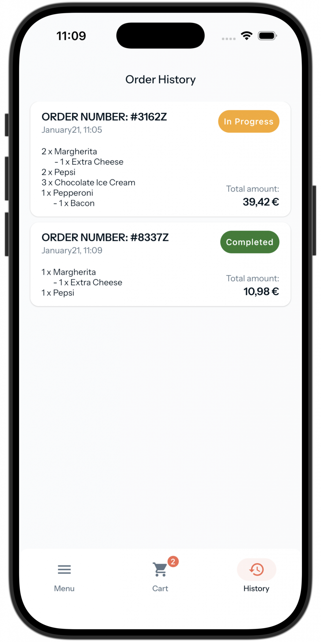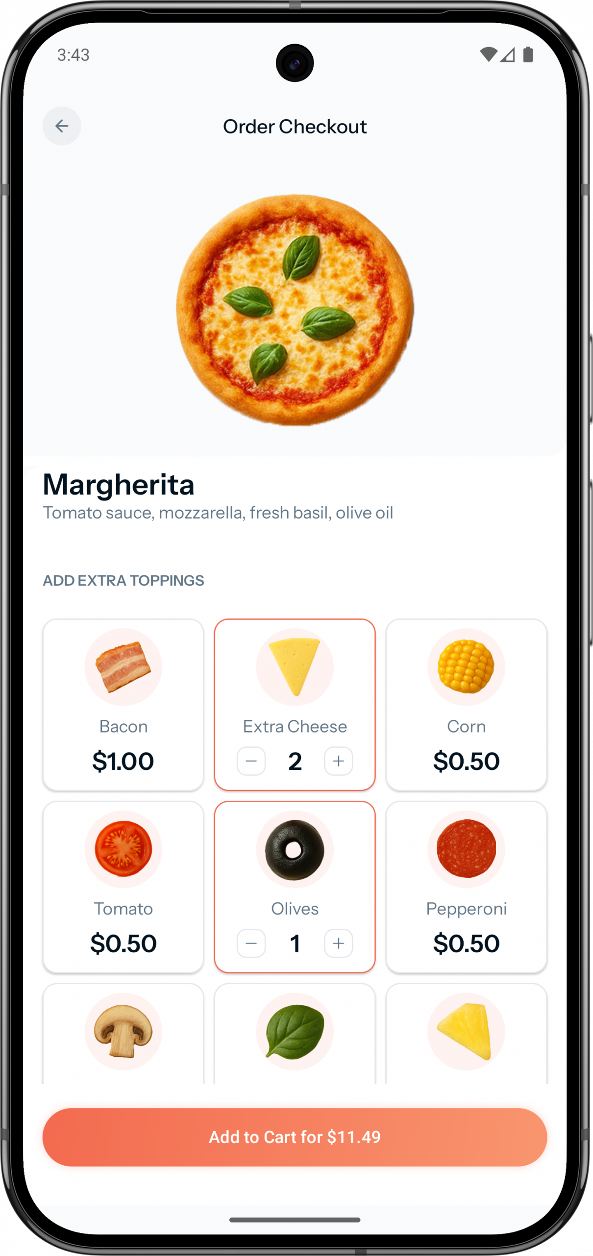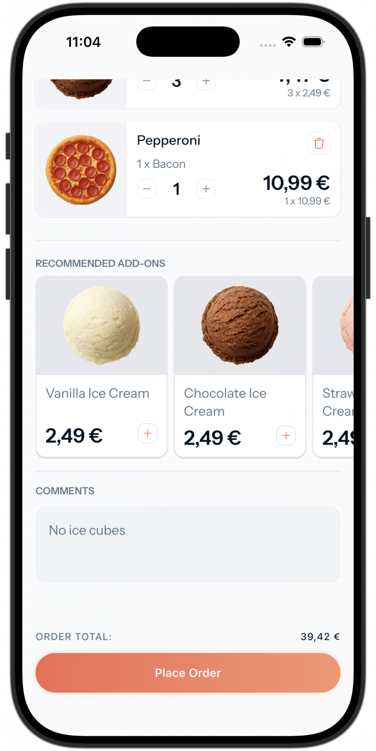 Users can search in different item categories. In the pizza detail screen addiontal toppings can be selected to a pizza.
